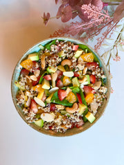 Rice-free, tofu, quinoa, strawberry, clementine, mango, pineapple, mixed greens, edamame, cucumber, avocado, nuts, Japanese spices, lotus.