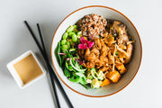 Assorted mushrooms, tricolor quinoa, mesclun salad, grilled marinated sweet potato, cucumber, avocado, wakame, edamame, pesto-balsamic sauce