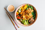 Spicy cajun tofu, grilled pepper, zucchini, eggplant, tricolor quinoa, edamame, mango, avocado, mesclun, rice, marinated seaweed, seaweed flakes